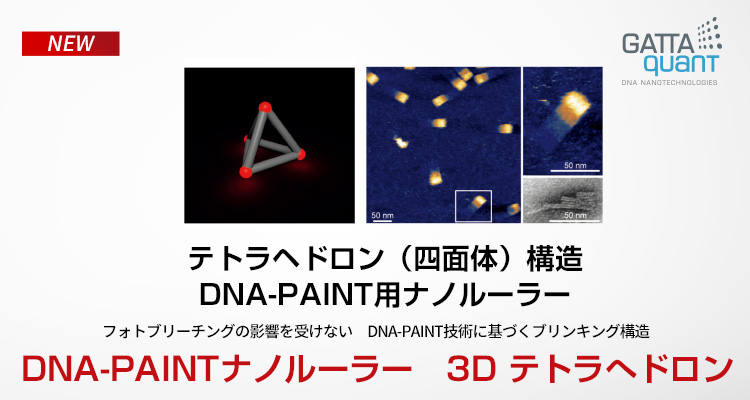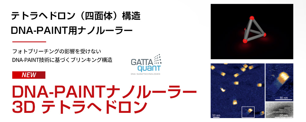 GATTA-PAINTシリーズの3Dナノルーラーは、DNA-PAINT技術に基づくブリンキング機構により、サンプルはほとんどフォトブリーチングの影響を受けません。サンプルはテトラヘドロン(四面体)構造で構成されており、各頂点にスポットが配置されています。これにより、Z軸方向での解像度性能を評価することが可能です。詳しくはお問い合わせください。