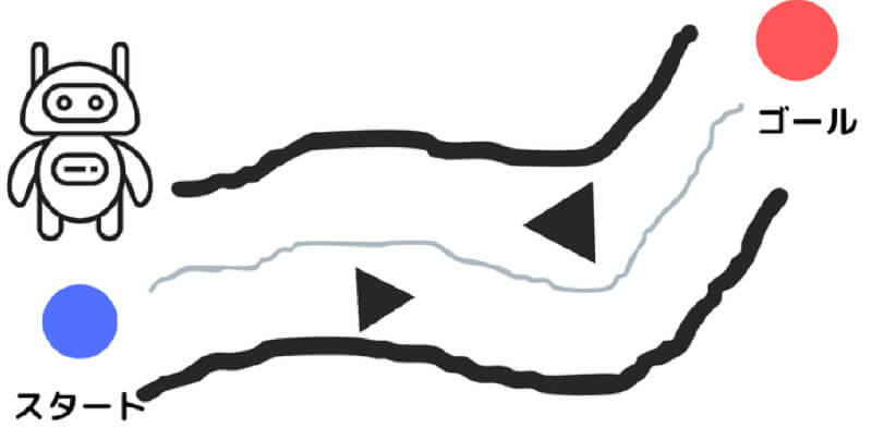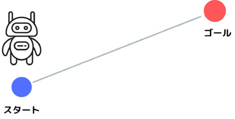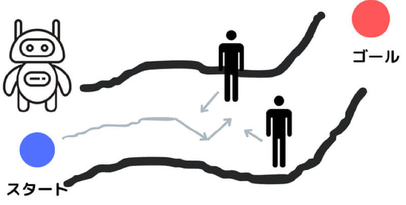 このときに、ゴールまでの真っ直ぐな線を進むだけならとても簡単ですが、実際は経路が曲がっていたり、経路上に物が置かれていたりするので、それらを「避けて」動く必要があります。