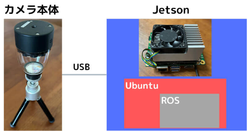 PALのカメラ本体をJetsonというGPUが搭載された小型パソコンに接続することで、Jetson上でGPUを用いた人検出を行う計算が実行できるようになっています。