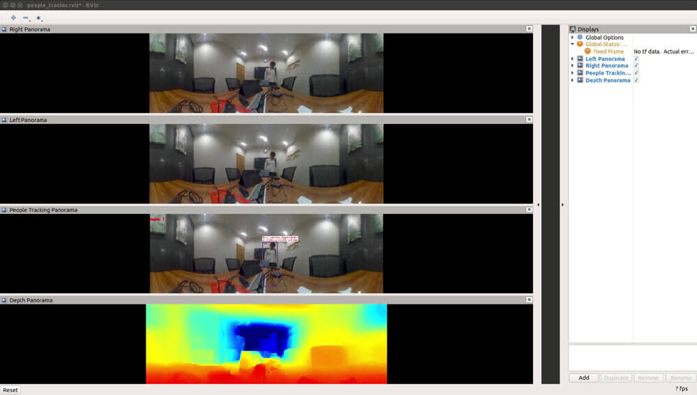 Rvizのウィンドウには上から順番に、ステレオの左画像、右画像、人検出結果の画像、深度画像の順に表示されます。