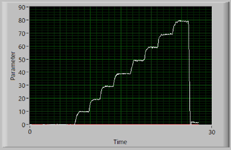 10mmずつ伸ばして測定したところ、高い精度と応答速度でセンサ伸びの測定ができることが確認できました。